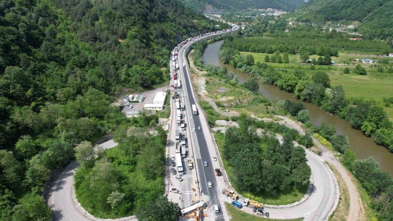 Türkiye’nin önemli geçiş güzergahlarından biri olan Sakarya-Bilecik D-650 kara yolunun Geyve ilçesi Şerifiye Mahallesi mevkii Bilecik istikametinde meydana gelen olayda, İ.B. (47) idaresindeki As Piliç’e ait 25 ton tavuk yemi yüklü 54 AEC 112 plakalı Mercedes marka tır, 54 RB 006 plakalı hafif ticari araca çarptıktan sonra yan yatarak Bilecik istikametini kapattı. Yaralanın olmadığı kazanın haber verilmesi üzerine bölgeye jandarma ekipleri ve kara yolları ekipleri sevk edildi. Yaklaşık 1 saattir kapalı kalan yolda ekipler ummalı bir şekilde yolu ulaşıma açmaya çalışıyor. Meydana gelen kaza bölgesi ve oluşan kilometrelerce araç kuyruğu havadan da görüntülendi.