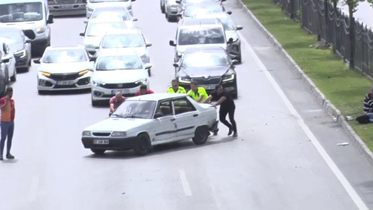 Gaziantep’te tırın otomobile çarptığı kazada 2 kişi yaralandı. Kaza sonrası sol şeridi kapatan otomobili polisler ve vatandaşlar iterek yol kenarına çekti.