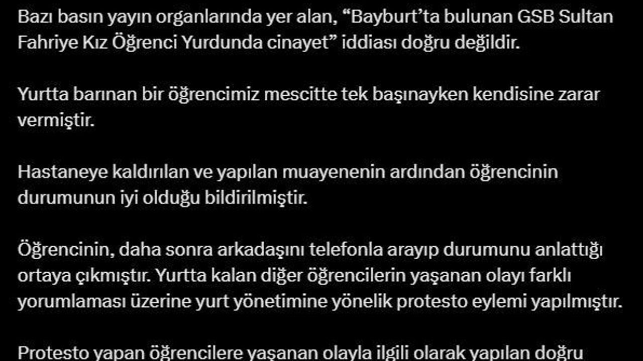 KYK’nın sosyal medya hesabından yapılan açıklamada, bazı basın yayın organlarında yer alan, "Bayburt’ta bulunan GSB Sultan Fahriye Kız Öğrenci Yurdunda cinayet işlendiği" iddiasının doğru olmadığı aktarıldı. Yurtta barınan bir öğrencinin mescitte tek başınayken kendisine zarar verdiği belirtilen açıklamada, "Hastaneye kaldırılan ve yapılan muayenenin ardından öğrencinin durumunun iyi olduğu bildirilmiştir. Öğrencinin, daha sonra arkadaşını telefonla arayıp durumunu anlattığı ortaya çıkmıştır. Yurtta kalan diğer öğrencilerin yaşanan olayı farklı yorumlaması üzerine yurt yönetimine yönelik protesto eylemi yapılmıştır. Protesto yapan öğrencilere yaşanan olayla ilgili olarak yapılan doğru bilgilendirmelerin ardından öğrenciler dağılmıştır. Konuyla ilgili olarak adli makamlar tarafından inceleme ve soruşturma başlatılmıştır" ifadelerine yer verildi.