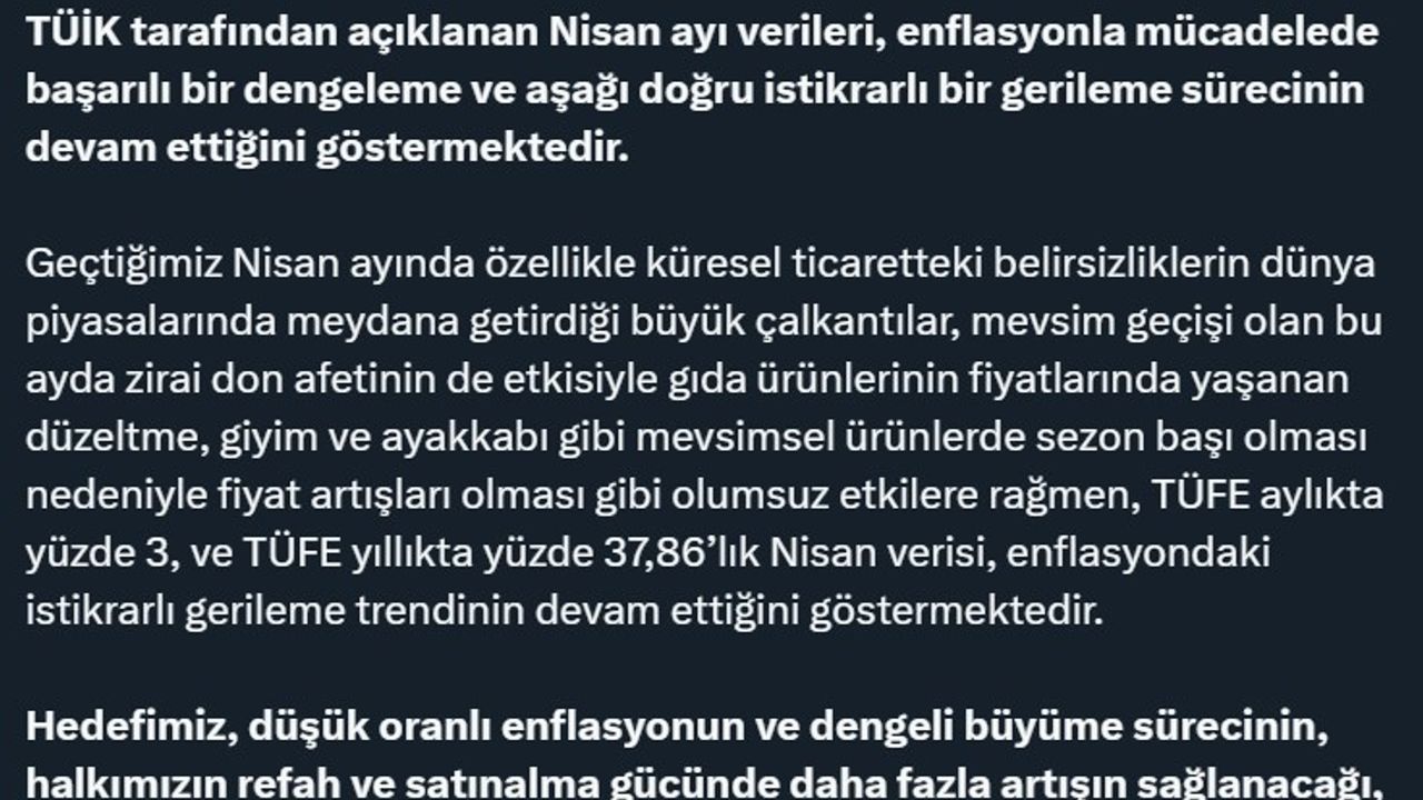 "TÜİK tarafından açıklanan Nisan ayı verileri, enflasyonla mücadelede başarılı bir dengeleme ve aşağı doğru istikrarlı bir gerileme sürecinin devam ettiğini göstermektedir. Geçtiğimiz Nisan ayında özellikle küresel ticaretteki belirsizliklerin dünya piyasalarında meydana getirdiği büyük çalkantılar, mevsim geçişi olan bu ayda zirai don afetinin de etkisiyle gıda ürünlerinin fiyatlarında yaşanan düzeltme, giyim ve ayakkabı gibi mevsimsel ürünlerde sezon başı olması nedeniyle fiyat artışları olması gibi olumsuz etkilere rağmen, TÜFE aylıkta yüzde 3, TÜFE yıllıkta yüzde 37,86’lık Nisan verisi, enflasyondaki istikrarlı gerileme trendinin devam ettiğini göstermektedir. Hedefimiz, düşük oranlı enflasyonun ve dengeli büyüme sürecinin, halkımızın refah ve satınalma gücünde daha fazla artışın sağlanacağı, yurt içi ve uluslararası alanda güçlü ve dirençli bir ülkemiz ekonomisini sürdürülebilir kılmaktır."