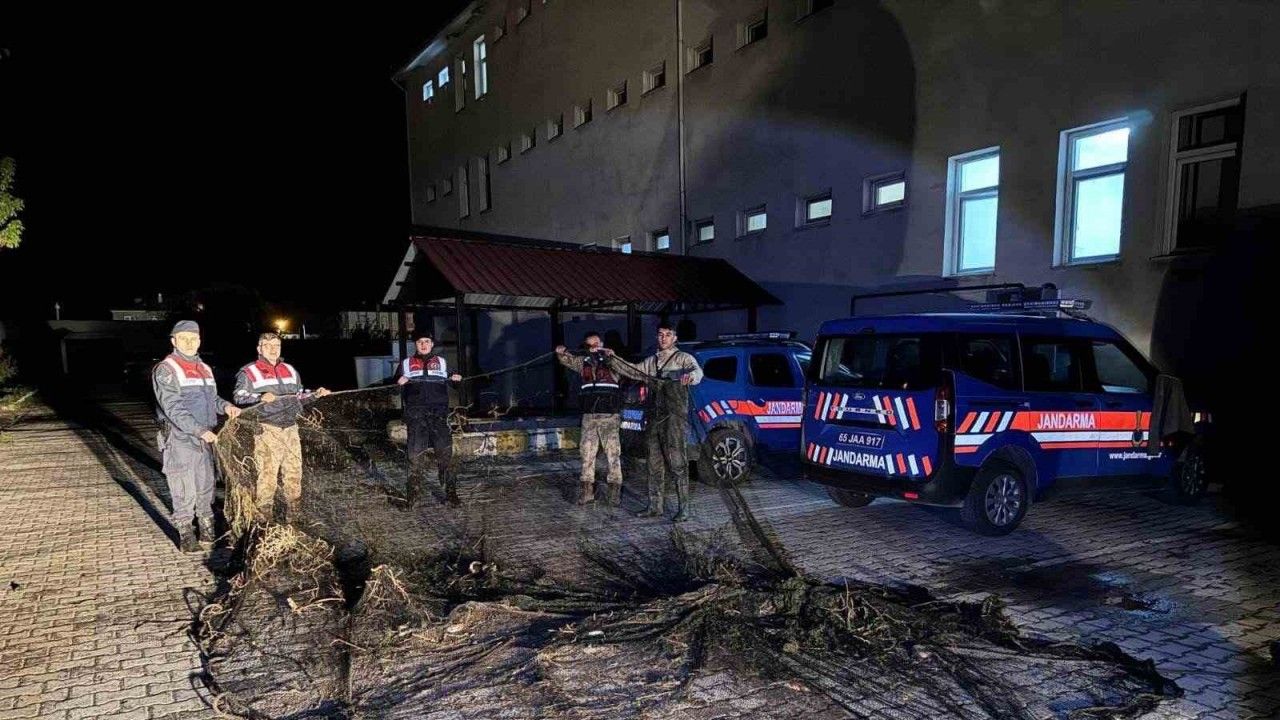 Van’ın Muradiye ilçesinde ekiplerin yaptıkları denetimlerde 1 ton canlı inci kefali ile 100 metre uzunluğunda manyat ağı ele geçirildi.